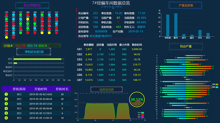 经编数字化车间生产管理系统大屏使得生产管理便捷智能化、远程运维实时全面化和故障诊断高效精准化,为管理人员管理生产车间提供了极大的便利性。