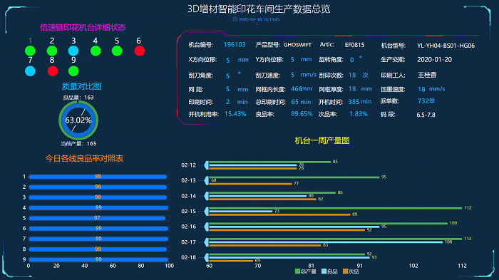 印花数字化车间生产管理系统大屏利用物联网技术降低了人工巡检的成本,提高了设备的运维效率,避免设备因故障停机未被发现导致生产滞后的问题。