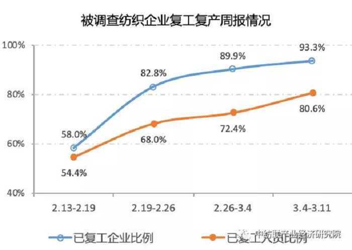 最近一周,纺织产业链中下游企业复工复产情况进一步改善,纺织服装专业市场复工开市进度有所加快,纺织全产业链上下游协同运转效率进一步恢复。